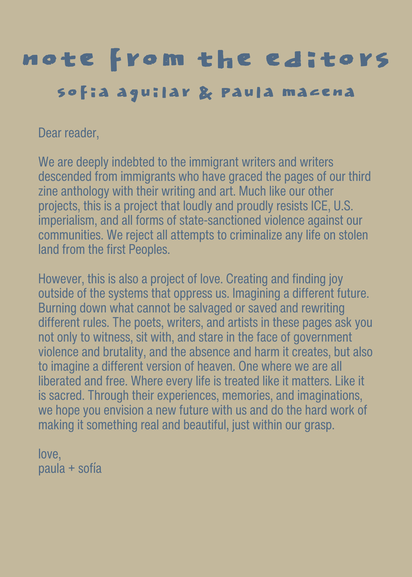 Released alongside our annual event, MAKE POETRY PUNK AGAIN, this zine anthology asks artists and writers to imagine a heaven without borders. All proceeds from the zine are distributed to fundraisers helping communities affected by ICE. In stock.